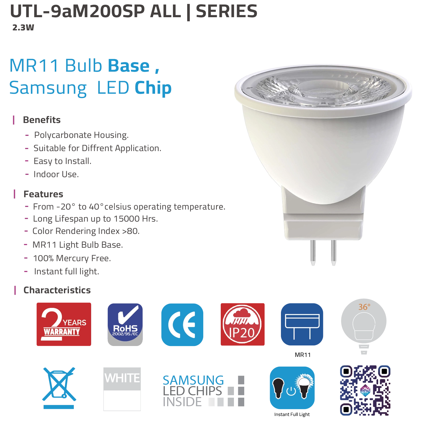 The Ultra Light LED MR11 Bulb (UTL-9aM200SP) combines compact design with Samsung LED technology to deliver instant full light and maximum energy efficiency. Perfect for spot lighting and decorative indoor use.