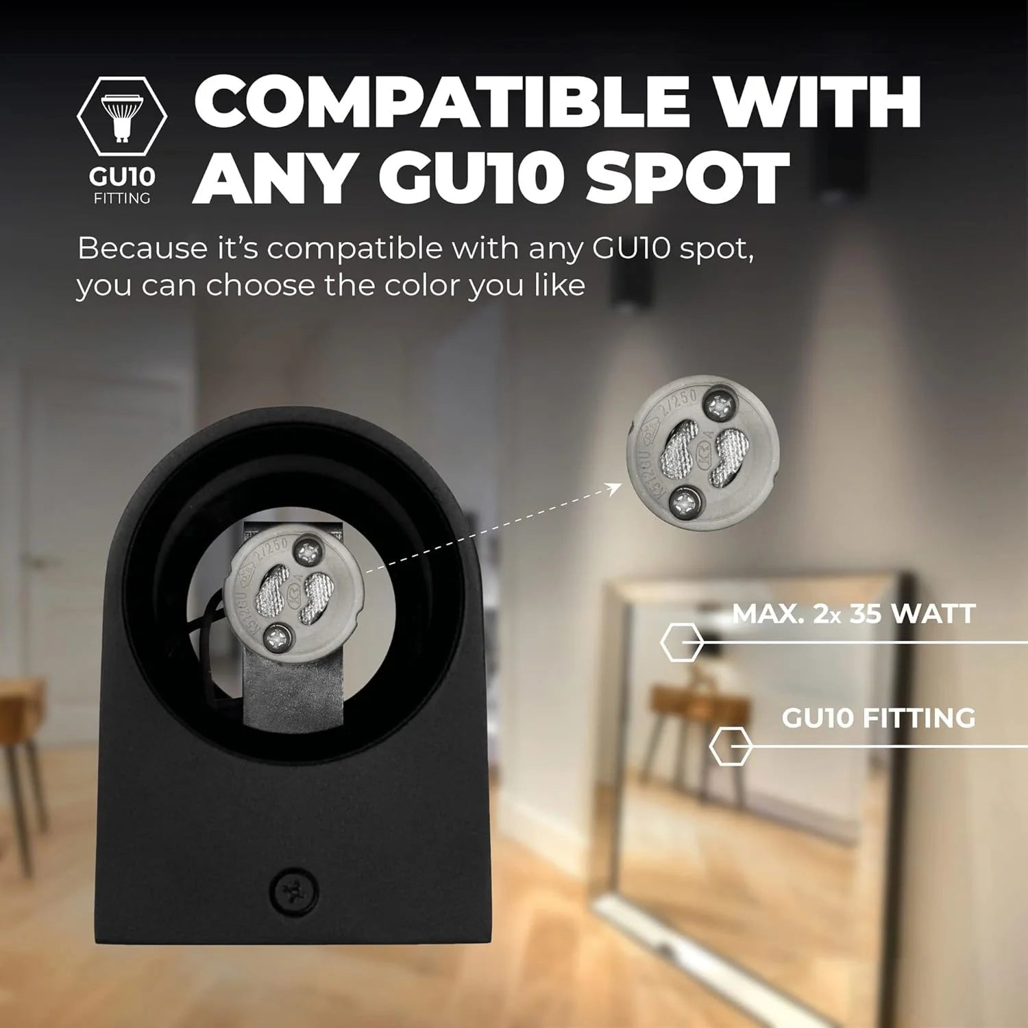 القدرة القصوى: 2 × 35 واط – يدعم لمبات LED GU10.