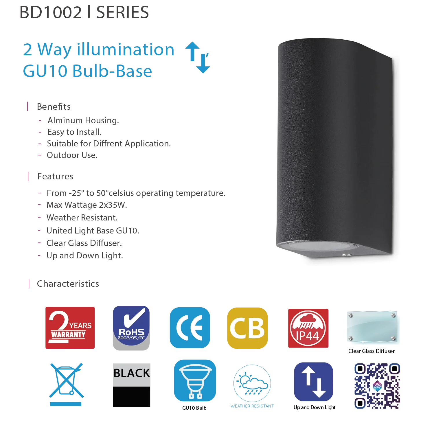 كشاف جداري عصري مع قاعدة GU10 - إضاءة جدارية خارجية مزدوجة لأعلى وأسفل (BD1002)