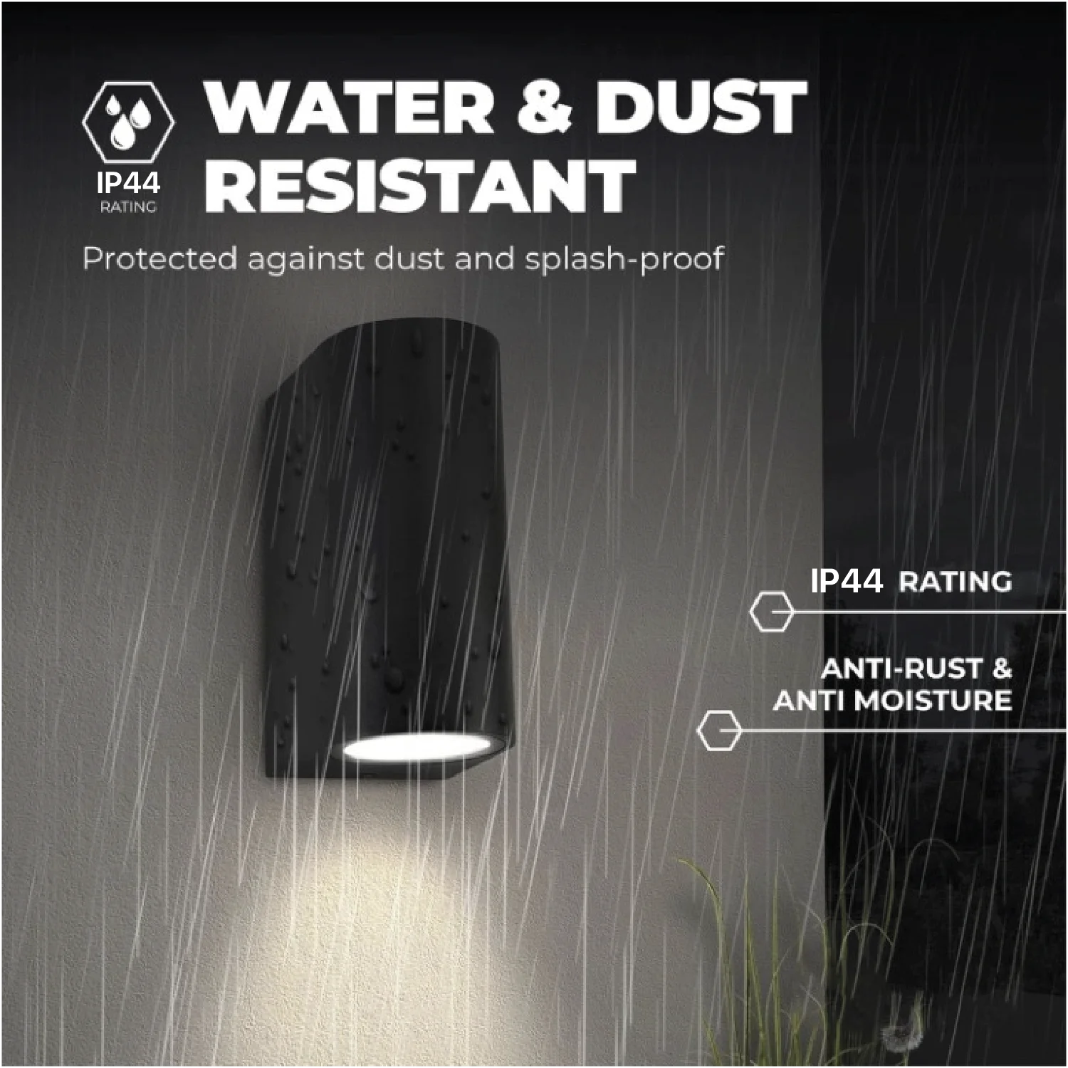 تصنيف IP44 – مقاوم للعوامل الجوية، مثالي للاستخدام الخارجي مثل الحدائق، المداخل، وواجهات المباني.